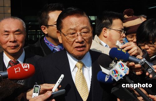 一月九日上午,海协会与海基会联合参访团在广州考察一家台资企业。考察结束后,台湾海基会董事长江丙坤接受两岸记者联合采访。 中新社发 柯小军 摄