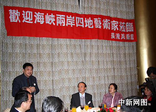10日晚,台湾长流美术馆在台北圆山饭店宴请前来参加活动的两岸及港澳三十多名画家。(中)为台湾长流美术馆馆长黄承志。(左一)致辞者为中国油画家学会副会长张祖英。 中新社记者陈立宇 摄