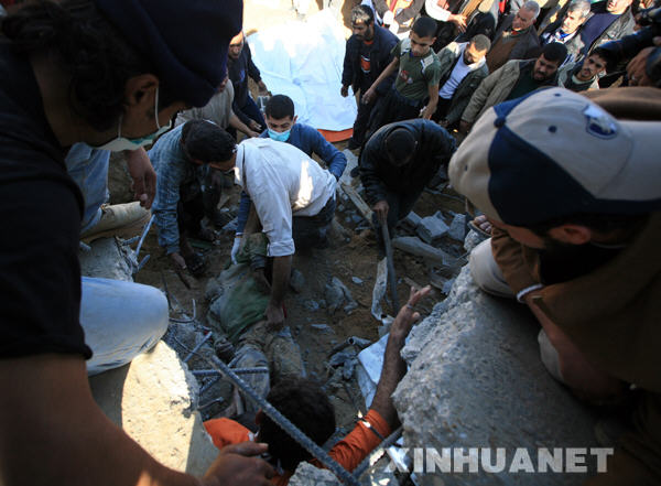1月18日,在加沙城东部,巴勒斯坦人从废墟中挖出一名遇难儿童的遗体。以色列总理奥尔默特当日说,尽管以方已在加沙地带实施单边停火,但如果巴勒斯坦有关武装派别不停止火箭弹袭击,以方有权重新展开军事行动。新华社记者纳赛尔摄