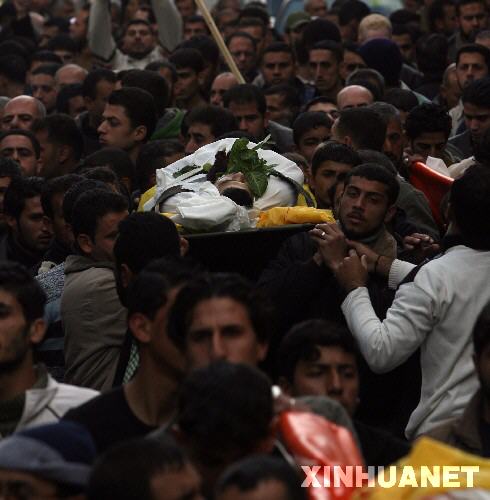 1月17日,在加沙地带北部,巴勒斯坦人为以色列空袭中的遇难者举行葬礼。以色列安全内阁当晚投票决定,在加沙地带实行单方面停火。以色列自去年12月27日向加沙地带发动大规模军事打击,至今已造成超过1200名巴勒斯坦人死亡,超过5300人受伤。 新华社记者纳赛尔摄