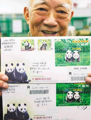 台湾“中华邮政”昨天发行猫熊邮票,吸引大批邮迷,一早就去排队的老先生,一买到马上就用首日封寄信到上海。台湾《联合报》图