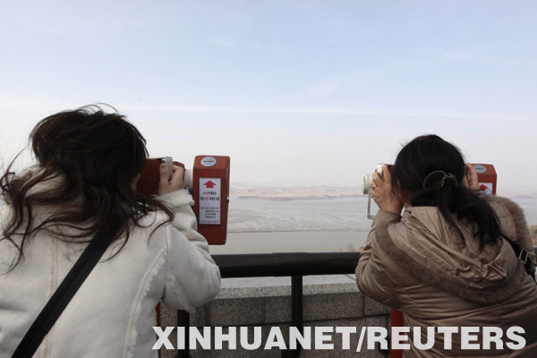 1月30日,在靠近韩朝边界韩国北部京畿道坡州市,两名游客用望远镜向朝鲜方向观望。新华社/路透