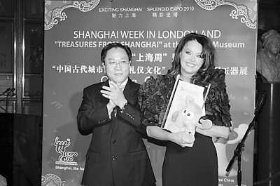 宋超还特别为记者介绍了在大英博物馆举办的作为开幕活动的“中国古代城市文明与礼仪文化——中国青铜玉器展”,它是伦敦上海周的一个亮点。来自上海博物馆的62件国宝级青铜器、玉器、陶器向英国民众集中展示了中国古代城市生活与社会礼仪。在为期两个月的展览中,它们将使更多伦敦人民感受中华文明的核心“礼”的魅力。充满活力的上海世博会吉祥物海宝在古老的大英博物馆展厅现身,揭开了2009伦敦上海周活动的序幕。