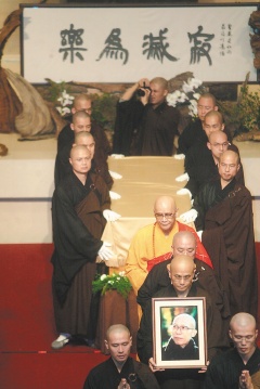 报道称,昨天上午9时,移灵仪式在法鼓山大殿举行,诵经声中,八位护灵法师在圣严法师棺柩上覆盖素色“华幔”,接着由僧伽会副会长今能长老说法,随即扶灵起龛。信众红着眼眶、双掌合十,冒雨在法鼓山道路两旁跪送,口中念着“阿弥陀佛”,目送灵车离去,满是不舍。