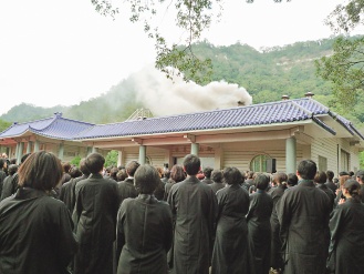 中国台湾网2月9日消息 据台湾《联合报》报道,台湾法鼓山创办人圣严法师3日圆寂,荼毘(梵语,火化之意)大典昨天下午在苗栗县南庄乡狮头山劝化堂举行,上万信众下跪相送,向圣严法师叩首。