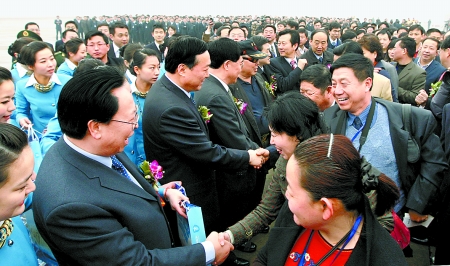 2月8日上午,省委书记徐光春、省委副书记陈全国等省领导,在郑州新郑国际机场为搭乘河南至台湾空中直航首航包机的旅客送行。本报记者 陈 伟 摄