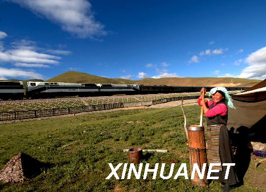 一列火车行驶在藏北牧场边(2006年7月20日)。7月8日,世界上海拔最高、冻土线路最长的铁路――青藏铁路正式通过国家验收,施工质量、环境保护等各项指标符合要求。新华社记者觉果摄