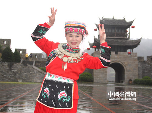 台湾客人对少数民族服饰兴趣很浓,图为一位参访团成员穿戴苗族衣饰拍照留念。 (中国台湾网 李杰 摄)