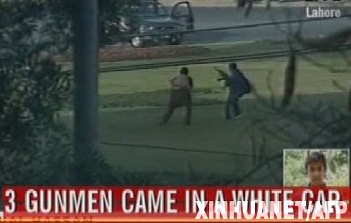 这张3月3日的电视截图显示,在巴基斯坦东部旁遮普省首府拉合尔,身份不明的持枪者袭击一辆载有斯里兰卡板球队队员的汽车,造成10多人死伤。 新华社/法新