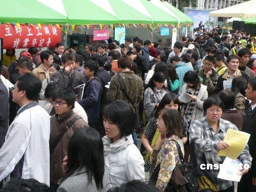 图为就业博览会上求职民众人潮涌动,人人都盼望能够“立即上工”。