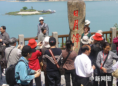 今天的日月潭碧水蓝天,波光粼粼,浙江游客泛舟湖上,在湖中小岛日月潭碑刻前,游客为拍照留影在烈日下苦等也乐此不疲,一位朱姓游客坦言,家乡的西子湖和日月潭各有千秋,“日月潭自然美,西子湖人文美,各有各的味道。”