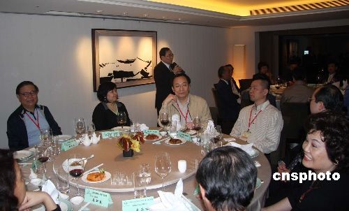自两岸交流以来层级最高的大陆中央媒体负责人访问团三月十九日晚抵达台北。图为台湾中国新闻学会在台北喜来登饭店为代表团举行欢迎晚宴。 中新社发 耿军 摄
