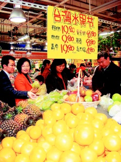 两岸直接“三通”后航运时间缩短,运输成本大降,上海超市趁势推出“台湾水果节”促销葡萄柚、杨桃、释迦、番石榴等台湾水果。图片来源:台湾《联合报》