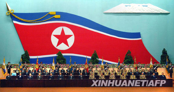 据朝鲜中央通讯社4月9日报道,朝鲜第12届最高人民会议第一次会议9日在平壤举行,再次推举金正日为国防委员会委员长。这张朝鲜中央通讯社4月9日提供照片显示朝鲜8日举行大会,庆祝朝鲜最高领导人金正日担任国防委员会委员长16周年。新华社/法新