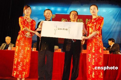 4月13日,第二届海峡两岸和谐文化节在福建泉州华光摄影学院开幕,活动通过两岸艺术文献的汇集展览和两岸文化艺术界人士的雅集联谊,共同抒写两岸和谐文化交流的新篇章。图为台湾两岸和谐文化交流协进会会长陆炳文向华光摄影学院赠送了中国国民党主席吴伯雄题写的“诸事和谐”贺词。 中新社发 黄瑶瑛 摄