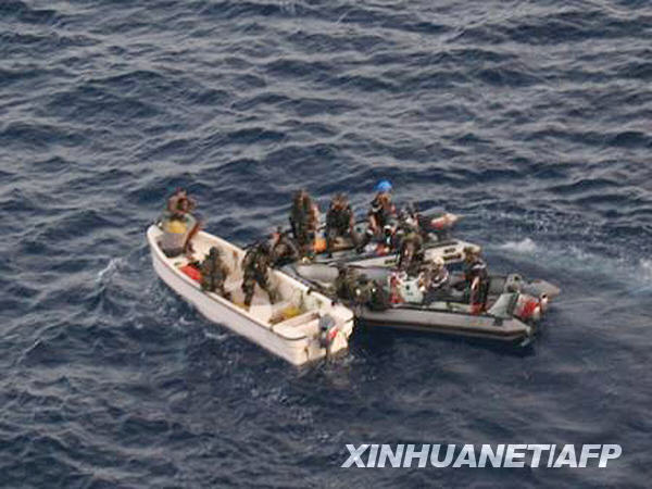 这张法国军方公布的照片显示,4月15日,法国士兵在肯尼亚附近海域抓获海盗。法国国防部15日宣布,一艘法国军舰当天在肯尼亚附近海域巡逻时抓获了11名海盗。 新华社/法新