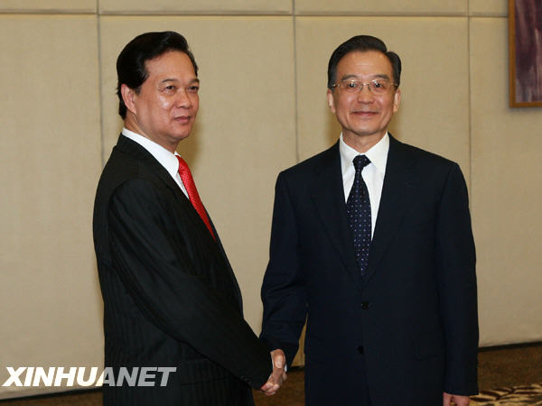 4月17日,国务院总理温家宝在海南三亚会见前来出席博鳌亚洲论坛2009年年会的越南总理阮晋勇。新华社记者 庞兴雷 摄