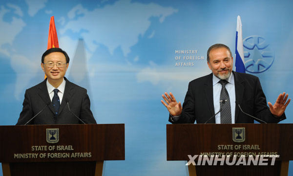 4月23日,以色列外交部长利伯曼(右)与到访的中国外交部长杨洁篪在耶路撒冷会见后共同举行新闻发布会。新华社记者殷博古摄