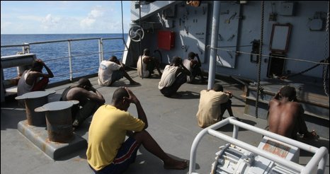 被抓获的海盗在军舰上受看押。