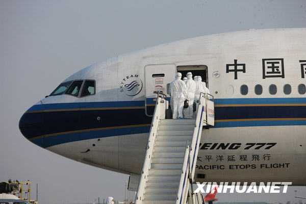 飞机在上海浦东机场平安着陆后,停靠在809号远机位,浦东机场和检验检疫局等部门立即选派专业人员,按照国家质检总局的程序和上海市的要求,对飞机和旅客进行防疫消毒,首先上飞机对旅客和机组健康状况进行全面掌握,确认机上人员健康无异常后,才组织旅客下飞机和卸下行李货物,上海市有关部门按照规定随即对乘机旅客进行隔离观察。南航对飞机内外进行全面清洁消毒,严密处理客舱垃圾污水并集中焚毁。由国家卫生检验检疫部门对飞机卫生状况全部验收合格后,飞机预计将于19时左右从上海起飞,空机飞回广州。