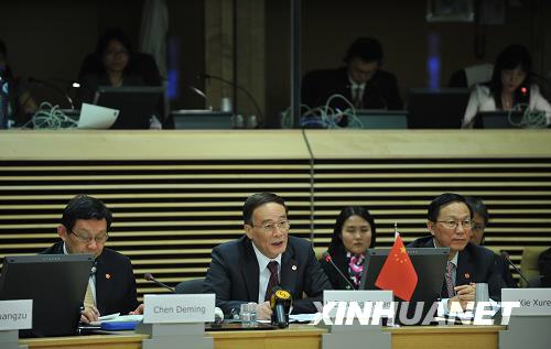 5月7日,在位于比利时首都布鲁塞尔的欧盟总部,中国国务院副总理王岐山(前中)、中国商务部部长陈德铭(前左)和中国财政部长谢旭人(前右)出席当天开幕的第二次中欧经贸高层对话。新华社记者武巍摄
