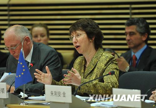 5月7日,在位于比利时首都布鲁塞尔的欧盟总部,欧委会贸易委员阿什顿在当天开幕的第二次中欧经贸高层对话会上发言。新华社记者武巍摄
