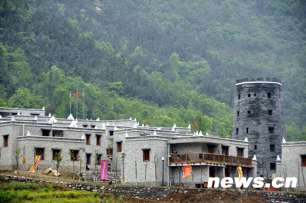 5月9日,“吉娜”新羌寨全貌。在去年5.12特大地震中遭受严重破坏的北川擂鼓镇猫儿石村“吉娜”羌寨,在山东省济南市对口援建下,从废墟上拔地而起,69户原“吉娜”羌寨居民今年春节前重新搬回新寨,迁入新居。新华网 前卫 摄