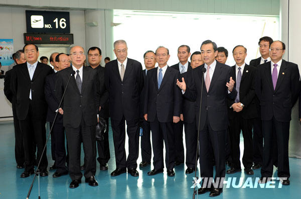 6月1日,中共中央台办主任王毅(前右)到机场为吴伯雄一行送行。