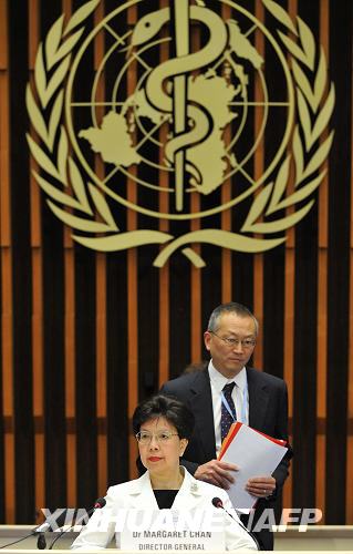 6月11日,世界卫生组织总干事陈冯富珍在新闻发布会上。当日,世界卫生组织总干事陈冯富珍正式宣布把甲型H1N1流感警戒级别升至6级。新华社/法新