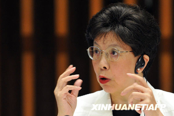 6月11日,世界卫生组织总干事陈冯富珍(前)在新闻发布会上。当日,世界卫生组织总干事陈冯富珍正式宣布把甲型H1N1流感警戒级别升至6级。新华社/法新