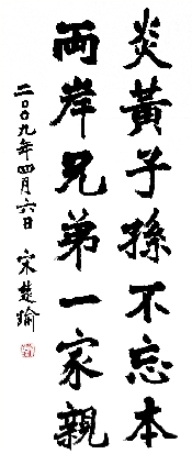 新华网河南频道6月18日讯 郑州日报报道:昨日,郑州黄河风景名胜区收到一份寄自宝岛台湾的珍贵“礼物”——亲民党主席宋楚瑜先生亲笔手书的“炎黄子孙不忘本 两岸兄弟一家亲”。14个遒劲有力的大字,蕴含着祖国宝岛炎黄子孙认祖归宗的强烈情感。