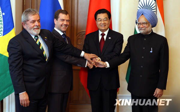 6月16日,中国、巴西、俄罗斯和印度“金砖四国”领导人在俄罗斯叶卡捷琳堡举行首次正式会晤,中国国家主席胡锦涛出席会晤。这是胡锦涛主席和巴西总统卢拉、俄罗斯总统梅德韦杰夫、印度总理辛格合影。新华社记者姚大伟摄