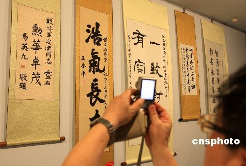 7月4日,“纪念戴安澜将军诞辰一百零五周年——海峡两岸书画交流邀请展”在上海紧张布展,一幅台湾地区领导人马英九专程送展的亲笔手书“勋华卓茂”引人注目。该展览将于5日开幕,展出书画作品三百五十幅,其中台湾地区作品八十幅,当中还有不少两岸知名人士“重量级”展品。 中新社发 潘索菲 摄