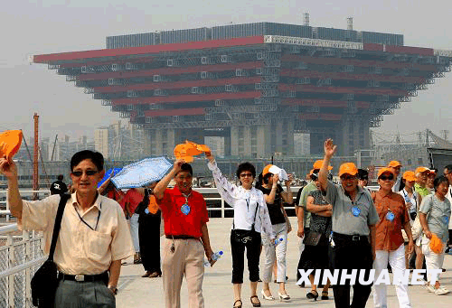 7月4日,一些参观者在世博会中国馆建设工地外围游览。7月5日,2010年中国上海世博会就将迎来开幕倒计时300天。截至7月1日,累计已有191个国家和48个国际组织确认参展上海世博会。目前,超过854万人次的上海社区居民参与了世博会知识培训,报名上海世博会志愿者的境内外人士已突破32万。 新华社记者 陈飞 摄