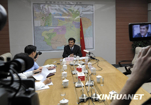 7月18日,新疆维吾尔自治区主席努尔·白克力(中)在乌鲁木齐市接受境外媒体采访。新华社记者赵戈摄