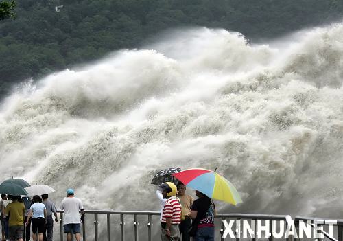 8月8日,台湾桃园石门水库实施调节性排洪。今年第8号台风“莫拉克”给台湾部分地区带来大量降雨,原本缺水的台湾桃园石门水库目前已接近满水位。考虑到水库结构安全,石门水库从8日2时起实施调节性排洪。新华社发(吴景腾 摄)