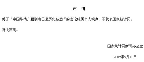 人民网北京9月11日电(记者 姚晓晨) 针对官员关于“中国取消户籍制度已是历史必然”的说法,国家统计局网站10日晚间发布声明称,该言论纯属个人观点,不代表国家统计局。