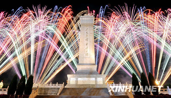 10月1日,首都各界庆祝中华人民共和国成立60周年联欢晚会在北京天安门广场举行。这是天安门广场燃放烟花。新华社记者王毓国摄