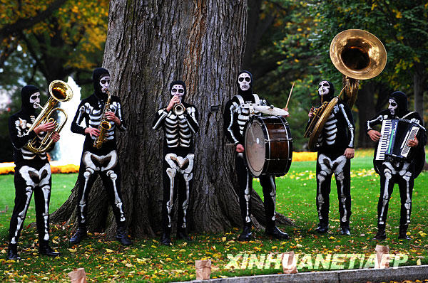 10月31日万圣节前夜,打扮成骷髅摸样的乐手在美国白宫外演奏。当天,美国总统奥巴马与妻子米歇尔在白宫与孩子们共度万圣节。新华社/法新
