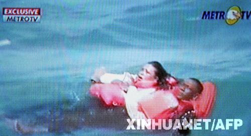这张11月22日拍摄的电视截图照片显示,在靠近新加坡的卡里摩岛附近,两名遇险乘客在海上等待救援。一艘载有约250人的渡轮当天在印尼苏门答腊岛附近沉没,目前已有97名乘客被救起,至少1人死亡,失踪人数尚无法确定。新华社/法新