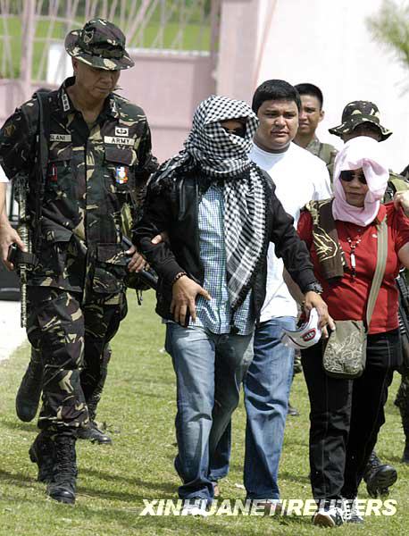 11月26日,在菲律宾马京达瑙省,警方押解菲律宾达都温赛市市长小安达尔·安帕图安(中)。菲律宾军方26日说,菲武装部队当天上午已控制马京达瑙省首府沙立夫阿瓜克市,该省省长安达尔·安帕图安之子、绑架和屠杀事件主要嫌疑人小安达尔·安帕图安已向当局自首。新华社/路透