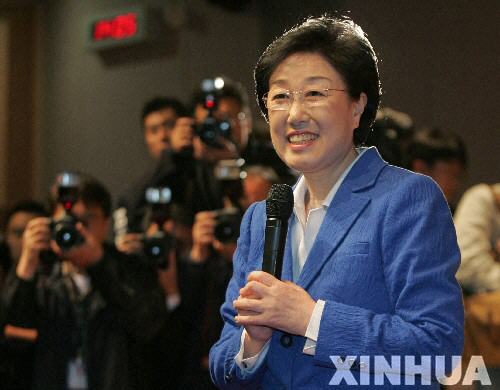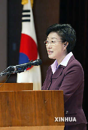 资料图片:2007年3月7日上午,韩国总理韩明淑在首尔发表告别讲话。当天,韩国首位女总理韩明淑正式辞去总理职务。 新华社发(纽西斯通讯社)