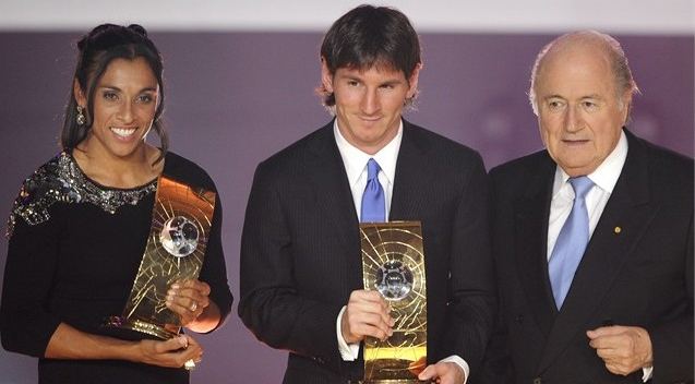 梅西(中)加冕世界足球先生,玛塔(左)连续第四次当选世界足球小姐。国际足联主席布拉特与他们合影。