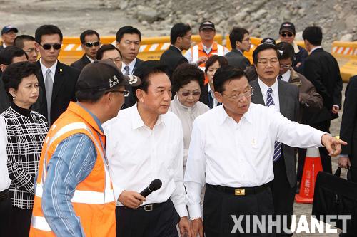 12月24日,海协会会长陈云林(前中)率海协会协商代表团部分成员赴南投县水里乡新山村,考察“八八水灾”灾区。海基会董事长江丙坤、南投县县长李朝卿陪同考察。新华社记者 袁满 摄