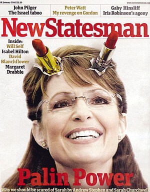 美国前阿拉斯加州州长、2008年总统大选副总统候选人萨拉·佩林被称为共和党的“黩武主义者”。日前佩林遭英国左翼杂志《新政客》恶搞,封面照片中佩林变身恶魔,头上长出“口红双角”。