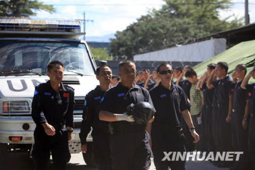 1月16日,在海地首都太子港,中国驻海地维和警察防暴队的官兵运送被埋战友遗体回营地。新华社记者邢广利摄