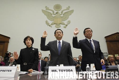 2月24日,日本丰田汽车公司总裁丰田章男(中)在华盛顿举行的美国众议院监督和政府改革委员会听证会上宣誓。丰田章男当日在美国国会听证会上再次为丰田汽车安全问题道歉,并且承诺丰田将全面提升汽车安全以赢得消费者信任。新华社/路透