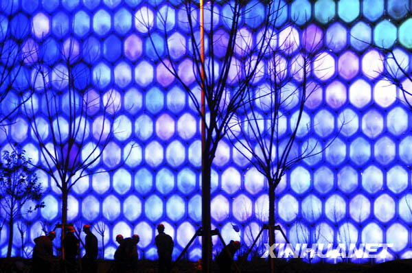 3月11日,工人在进行夜景灯光调试的信息通信馆前施工。 新华社发
