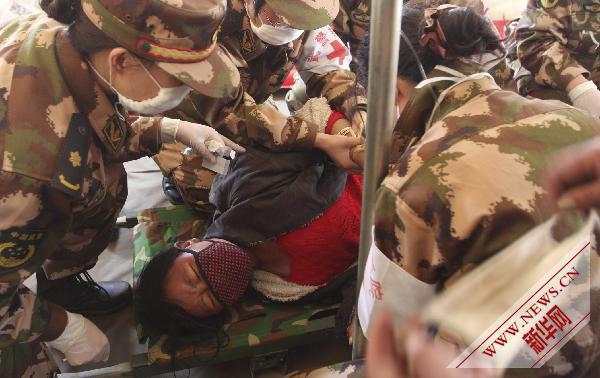 4月17日,一名刚被救出不久的结古镇伤员被送到武警青海总医院临时救助点接受治疗。青海玉树地震发生以来,来自解放军、武警部队医院的多支军医救护队在玉树搭建起临时救助点对灾区伤病员进行抢救和治疗,成为灾区生命的救助站。新华社发(郭国权 摄)
