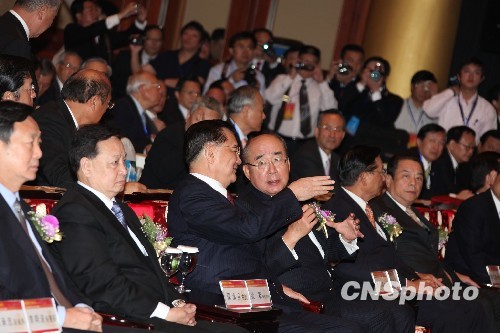 4月20日上午,2010台湾·湖北(武汉)周在台北圆山大饭店开幕。中国国民党荣誉主席连战(前排左三)、吴伯雄(左四),台湾海基会董事长江丙坤、台湾工业总会理事长陈武雄等人出席并致辞,左二为首度访台的中共湖北省委书记罗清泉。 中新社发 董会峰 摄